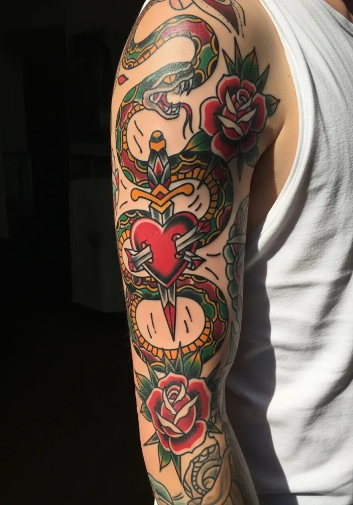 This tattoo captures the essence of American traditional art with a snake entwined around a dagger piercing through a heart. The colors are vivid bright red, deep green, and touches of gold and the clean black lines make it stand out from every angle. The surrounding roses complete the sleeve, giving it that balanced, classic composition.