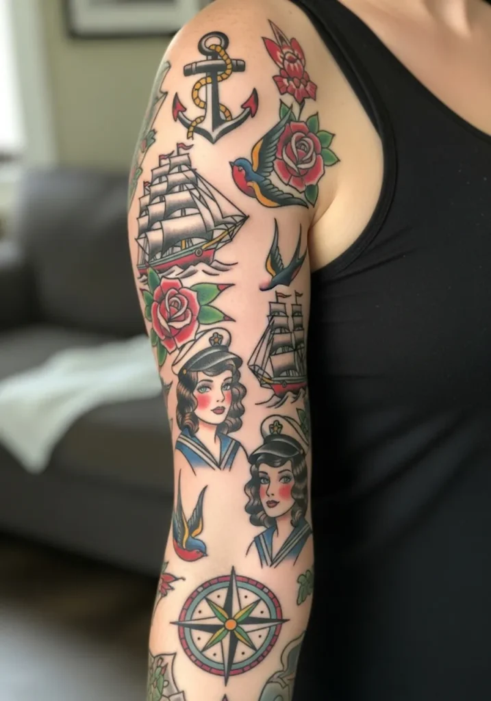 This arm tattoo brings together all the best nautical motifs ships, anchors, roses, swallows, and two classic sailor girls. The colors are bright and balanced, using reds, blues, and yellows to capture that perfect Americana tattoo charm.