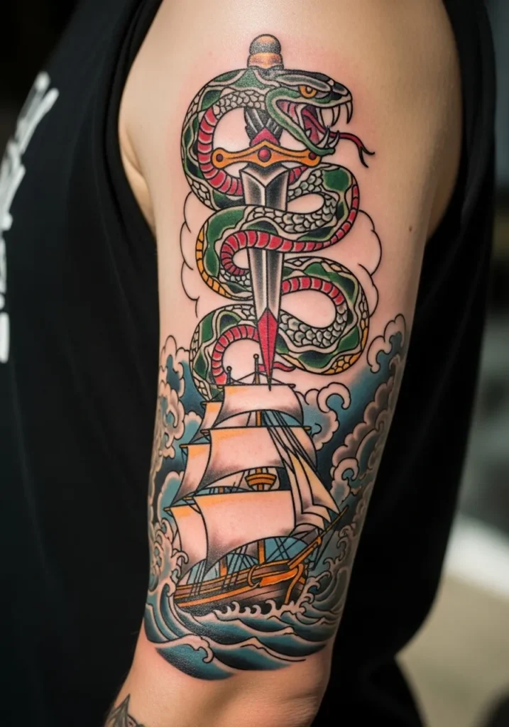 This upper arm tattoo tells a bold story with a green and red snake wrapped tightly around a dagger above a sailing ship on turbulent seas. The color palette of gold, blue, and deep green creates a strong visual rhythm that feels full of motion.