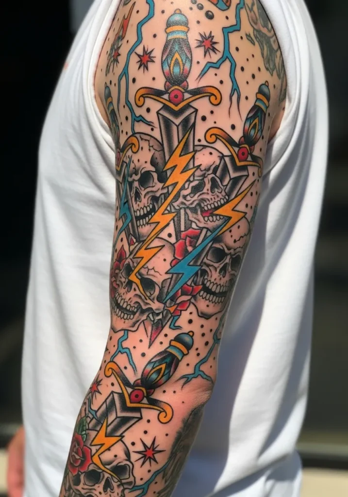 This electric tattoo sleeve combines skulls, daggers, and bolts of blue and yellow lightning for a seriously eye-catching effect. The placement is packed yet balanced, with classic roses adding bursts of red among the darker tones. Every detail pops thanks to the bold outlines and heavy shading that define American traditional work.