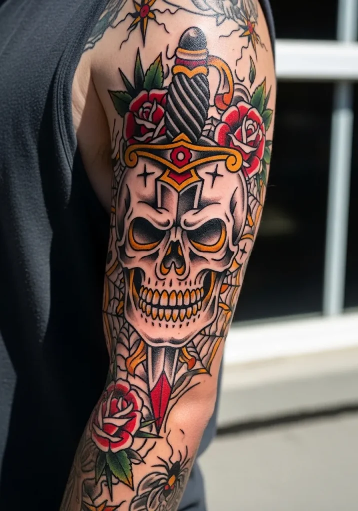 This upper arm tattoo features a menacing skull pierced by a dagger, surrounded by red roses and touches of gold. The bold outlines and solid color fills stay true to the American traditional style, while the fine black shading gives the skull a sense of depth. Pops of red, green, and yellow make the entire piece come alive against the skin.