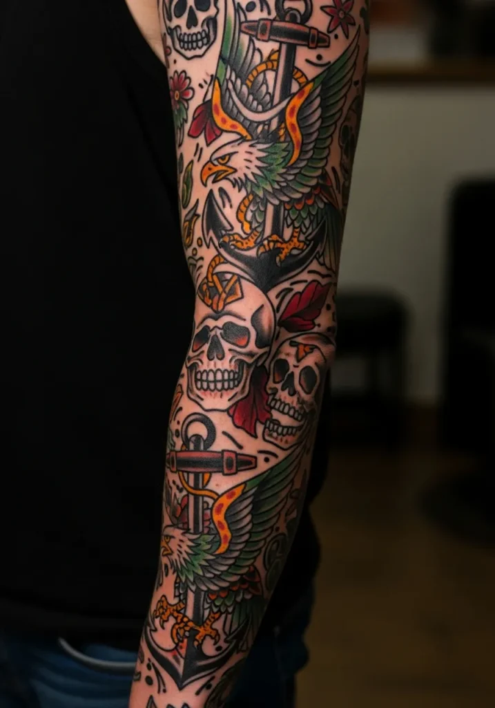 This full sleeve brings together everything that defines the old school style anchors, eagles, skulls, and vibrant pops of red and green. The details are strong, with the eagle s wings stretching across the arm and the anchors wrapped in rope adding classic nautical flair. Each skull adds just the right touch of edge, giving the whole piece a timeless toughness.