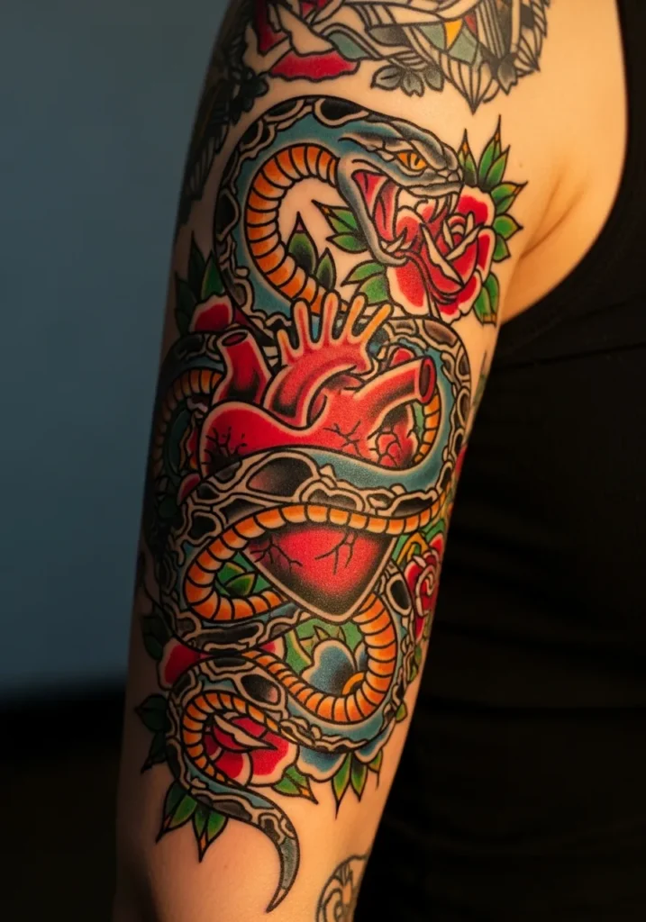 This striking upper arm tattoo showcases a coiled serpent wrapping tightly around a bright red heart, surrounded by roses and deep green leaves. The warm reds and cool blues contrast beautifully, and the detail in the scales and veins makes it look alive. The shading gives it a dramatic, almost storybook intensity.