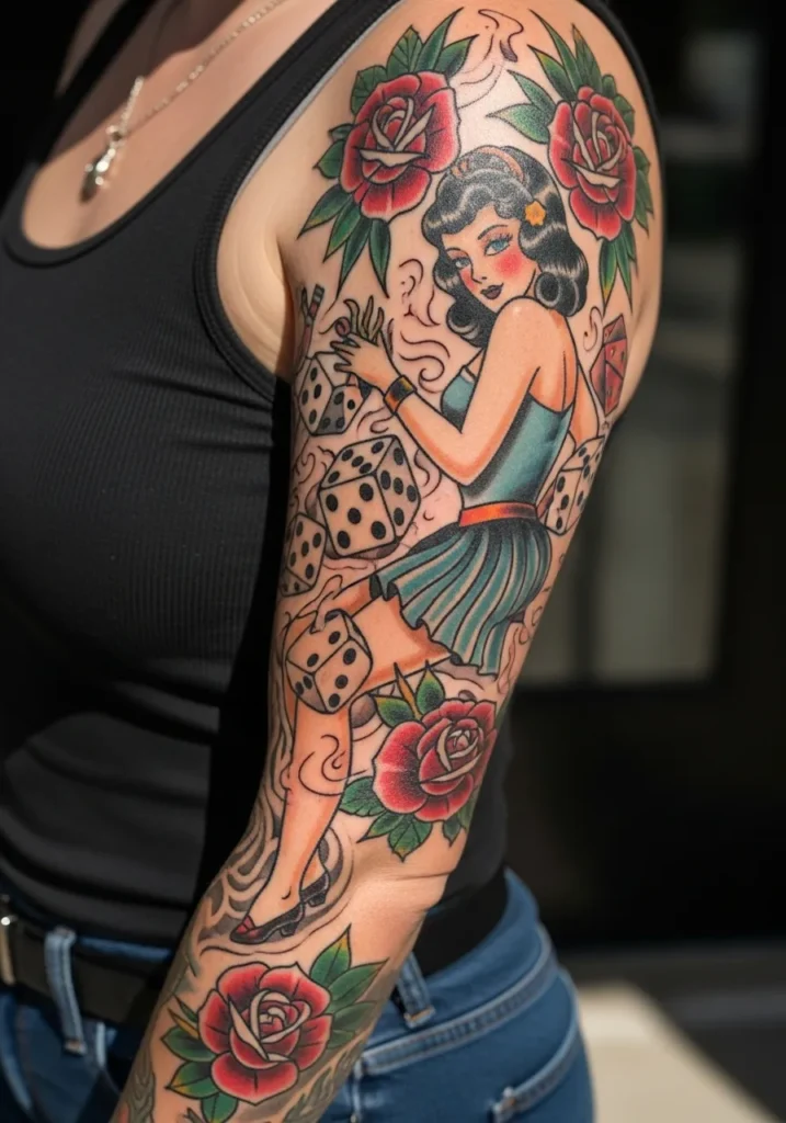 This tattoo sleeve shows a stunning pin-up girl surrounded by dice, roses, and playful curls of smoke. The color palette sticks to traditional tones of red, green, and muted teal, while the linework stays crisp and bold. The placement flows nicely down the arm, keeping the design feminine yet strong.