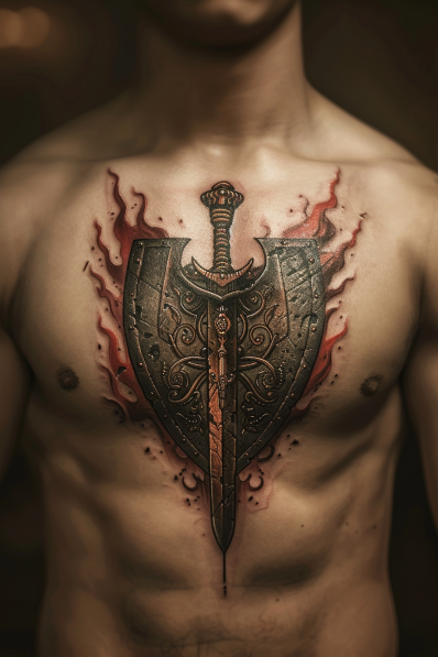 This chest tattoo features a powerful combination of a Spartan shield and sword, both detailed with intricate engravings. The shield has a classic, battle-worn appearance, complete with scratches and marks that tell a story of many battles fought. The sword, placed vertically down the center, is surrounded by a fiery red aura, adding intensity to the design. The flames give the impression that this tattoo isn t just a symbol of defense, but one of active battle readiness. Placed on the chest, it sits close to the heart, symbolizing a warrior s spirit.