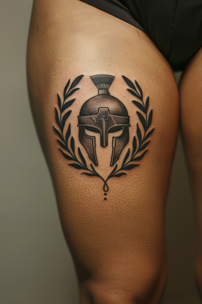 Spartan Helmet with Laurel Wreath Thigh Tattoo