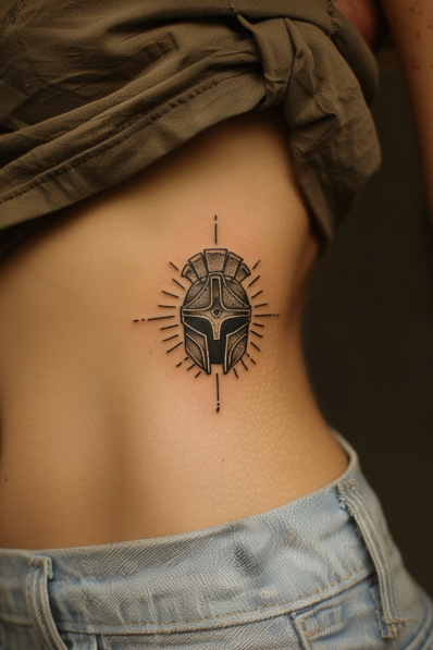 This minimalist Spartan helmet tattoo, placed on the ribcage, is small but packs a punch. The design features clean, sharp lines that form the iconic Spartan helmet, surrounded by subtle, radiating lines that give it an almost sunburst effect. The placement on the ribcage makes it an intimate piece, perfect for someone who wants a tattoo that is meaningful yet not immediately visible to everyone. The simplicity of the design keeps it elegant and timeless, while the detailed shading adds depth and texture.