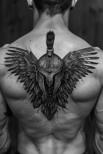 This back tattoo takes the classic Spartan helmet design and adds an impressive set of wings, spreading across the shoulders and upper back. The detailed wings create a dynamic look, almost giving the impression of the wearer ready to take flight. The Spartan helmet, placed at the center, maintains its iconic structure with clean lines and sharp shading. The combination of wings and the helmet symbolizes both strength and freedom, giving the tattoo a deeper meaning beyond its visual appeal.