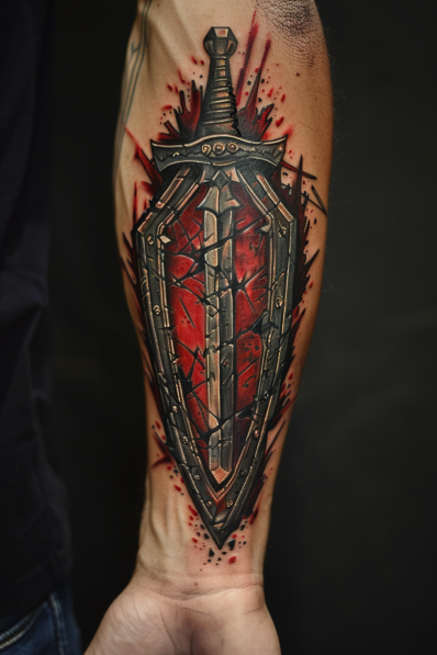 This powerful tattoo showcases a Spartan shield with a sword embedded in it, dramatically inked on the forearm. The design is intense, with the shield appearing battle-worn and cracked, while the sword stands firm, symbolizing unyielding strength. The vivid red background behind the shield adds a sense of urgency and fierceness, making the whole piece pop with energy. The detailed shading and use of color give the tattoo a three-dimensional effect, making it feel as though the sword could be pulled from the shield at any moment.
