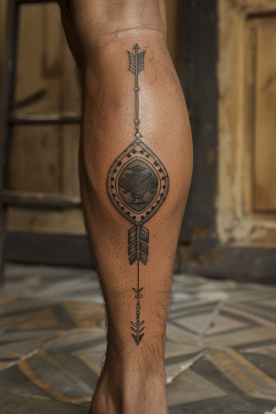 This tattoo features a Spartan shield placed centrally on the calf, with an arrow running vertically through the design. The arrow s clean, geometric lines contrast nicely with the detailed, circular pattern of the shield. The placement on the calf makes it a striking piece, visible yet subtle enough to be easily covered. The simplicity of the arrow, combined with the intricate shield, gives this tattoo a balanced and powerful look. The design plays on the idea of protection and direction qualities that resonate with Spartan ideals.
