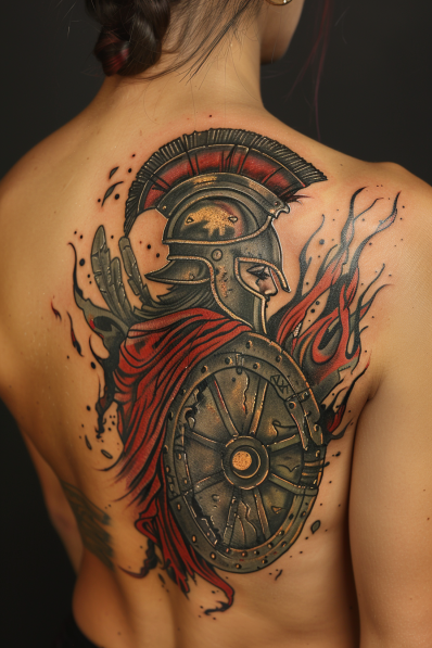 This impressive tattoo features a Spartan warrior in full armor, occupying a bold position across the entire upper back. The warrior is depicted with a detailed helmet, complete with a plume, and a large shield that bears the marks of battle. A striking red cape flows behind him, contrasting sharply with the metallic tones of the armor and shield. Flames and dynamic lines surround the warrior, adding a sense of movement and intensity to the design. The use of red highlights against the black and grey shading gives the tattoo depth and drama, making it a powerful statement piece.