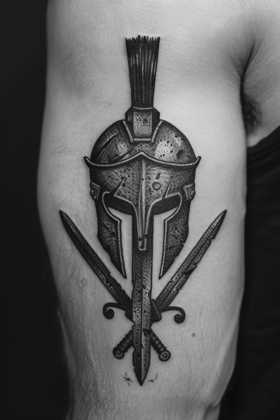 This striking tattoo features a detailed Spartan helmet with two crossed swords beneath it, inked in a bold black and grey style on the upper arm. The helmet, with its sharp edges and worn texture, evokes the strength and resilience of a Spartan warrior. The crossed swords add an extra layer of symbolism, representing readiness for battle and unwavering courage. The shading is meticulous, giving the entire design a three-dimensional, almost lifelike quality.