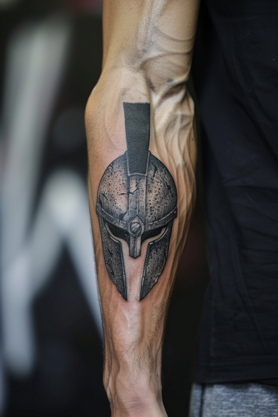 This tattoo features a bold and detailed Spartan helmet, expertly inked on the forearm. The helmet, with its strong lines and realistic texture, looks as though it s been through countless battles. The design is simple yet powerful, focusing on the helmet s iconic shape and the sharpness of its features. The shading adds depth, giving the helmet a weathered, metallic look that makes it stand out against the skin. The placement on the forearm is perfect, making the tattoo visible and allowing the design to flow naturally with the arm s shape.