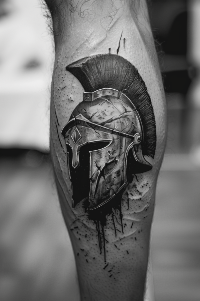 This tattoo features a bold and detailed Spartan helmet, meticulously inked on the calf. The helmet, with its distinct crest and battle-worn appearance, stands out with striking black and grey shading that adds depth and realism. The rough, splattered background gives the piece a gritty, raw edge, as if the helmet has just emerged from the heat of battle. The texture and shading on the helmet make it appear almost metallic, while the plume adds a touch of classic Spartan nobility.