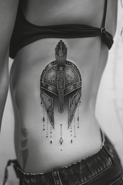 This tattoo showcases a beautifully detailed Spartan helmet, delicately inked on the ribcage. The helmet features intricate patterns and ornamentation, giving it a unique and almost regal appearance. Unlike the typical battle-worn Spartan designs, this helmet has a polished, almost ceremonial feel, enhanced by the fine line work and dotted details that cascade below. The shading is subtle, adding depth without overpowering the delicate nature of the design. The rib placement accentuates the curves of the body, making the tattoo both elegant and powerful.