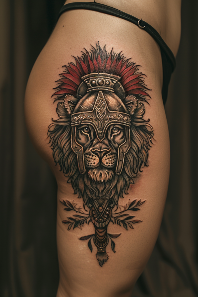 This striking tattoo features a powerful lion s face adorned with a Spartan helmet, inked beautifully on the thigh. The lion s mane flows with intricate detail, merging seamlessly with the ornate design of the helmet, which is accented by a bold red plume. The combination of the lion and Spartan imagery evokes a sense of royalty, courage, and fierce determination. Below the lion, delicate olive branches add a classic touch, tying the design together with a nod to both strength and peace. The shading and highlights give the tattoo a three-dimensional effect, making the lion appear as though it s ready to leap into action.