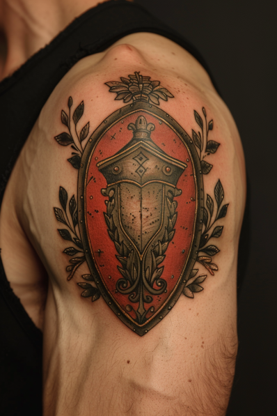 I find this tattoo to be a solid choice for anyone who admires Spartan culture. The shield represents protection and valor, and adding the olive branches is a nice touch, symbolizing the duality of war and peace. The red background really makes the design pop, and the placement on the shoulder makes it both visible and impactful. It s a tattoo that tells a story of strength, and let s be honest, it just looks really cool.