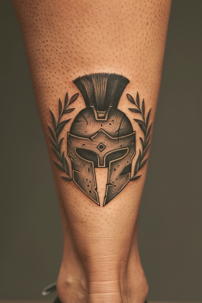 This Spartan helmet tattoo on the calf is a bold and striking design. The helmet, detailed with battle-worn marks, is flanked by a laurel wreath on each side, symbolizing victory and honor. The shading gives the helmet a realistic, three-dimensional appearance, while the laurel leaves add a touch of elegance to the overall design. The calf placement is perfect for showcasing this tattoo, allowing it to be a visible yet personal statement.