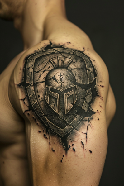 I think this tattoo is incredibly powerful and symbolic. The cracked shield with the Spartan helmet represents resilience and the idea of standing strong even when faced with challenges. The shoulder placement is ideal for this design, making it look like the shield is a natural extension of the body ready to protect at all times. It s a tattoo that tells a story of strength, endurance, and the warrior spirit, making it a perfect choice for someone who identifies with these values. If you want a tattoo that s bold, meaningful, and visually striking, this one definitely delivers.
