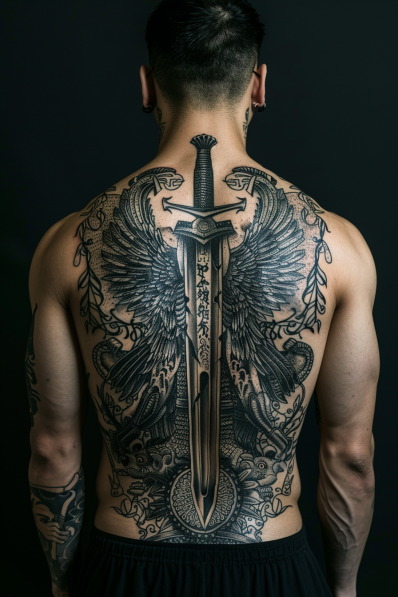 This tattoo is undeniably impressive. The full-back placement allows for a grand, expansive design that covers a lot of ground without feeling overcrowded. The sword at the center gives the piece a solid, grounding presence, while the wings add a dynamic and almost ethereal quality. It s a perfect balance between power and grace, making it a standout choice for anyone looking to make a bold statement with their ink. If you re into tattoos that combine elements of strength, freedom, and intricate artistry, this one really hits the mark. It s not just a tattoo it s a masterpiece that tells a story.