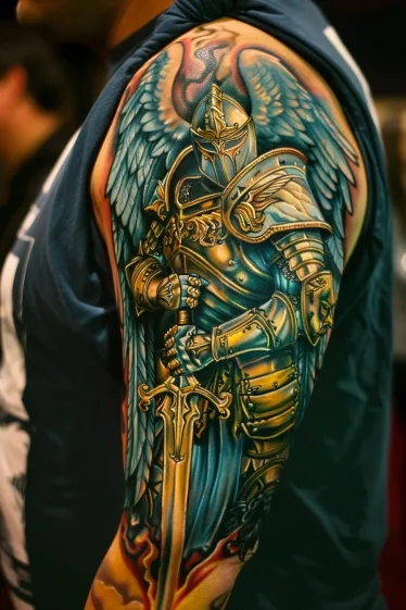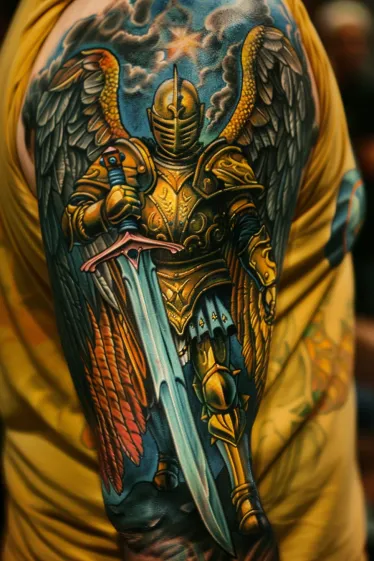 This is the kind of tattoo that just commands attention. The bold colors, the strong posture, and the mix of divine and warrior energy make it feel larger than life. I love how the golden hues pop against the stormy blues, creating that perfect contrast between power and serenity. There s something about the knight s stoic pose that speaks to honor, resilience, and inner strength. If you want a tattoo that exudes bravery with a celestial touch, this one is pure perfection.