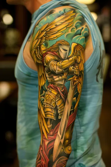 This powerful half-sleeve tattoo features an armored angel warrior, standing firm with a massive sword gripped tightly in both hands. The golden armor gleams under a celestial sky, reflecting an almost divine presence. His majestic wings, blending rich golds and fiery oranges, contrast against the deep stormy blue background, creating a breathtaking balance of light and shadow. Every inch of the armor is intricately detailed, from the ornate shoulder plates to the flowing cape that adds movement to the design.
