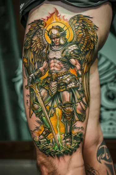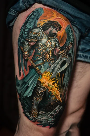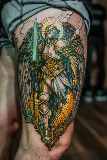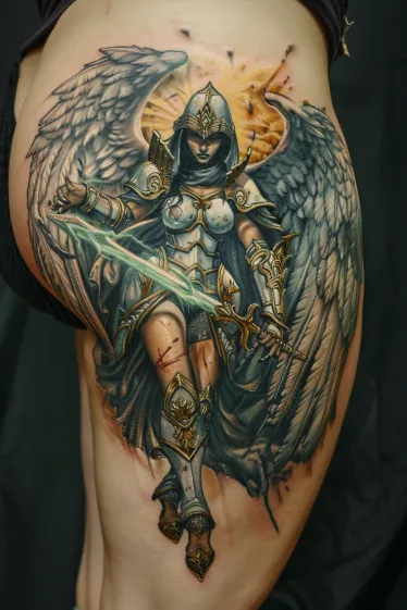Sacred Archangel Warrior Thigh Tattoo