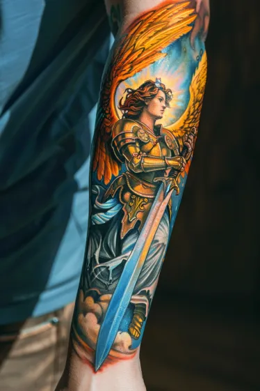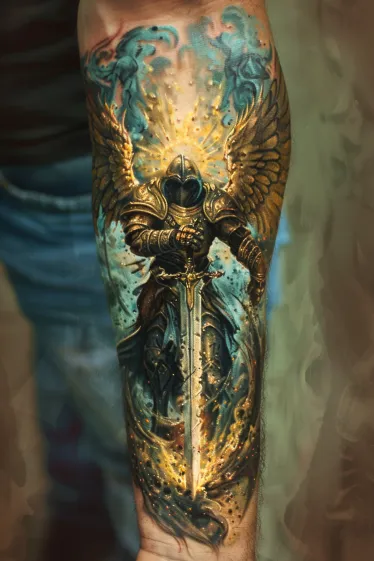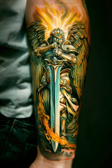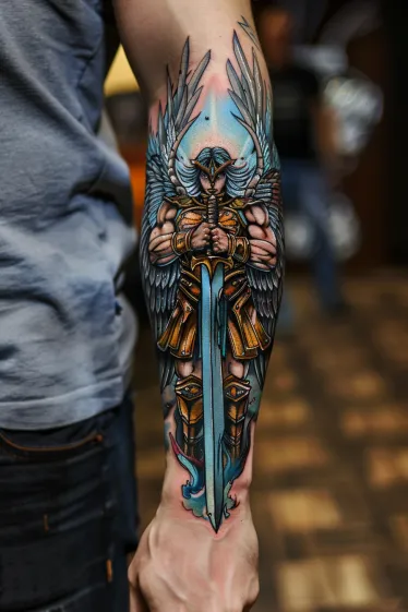 Angel Warrior Forearm Tattoo with a Divine Sword