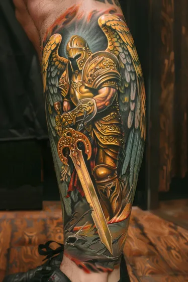 Golden Armored Angel Warrior Leg Tattoo
