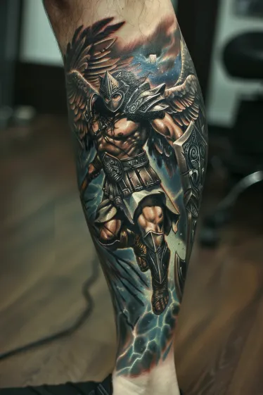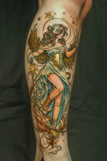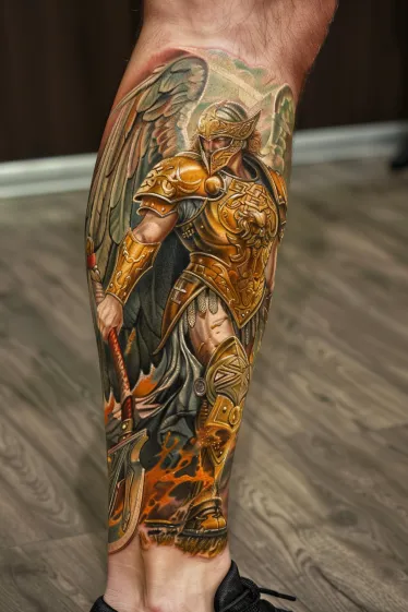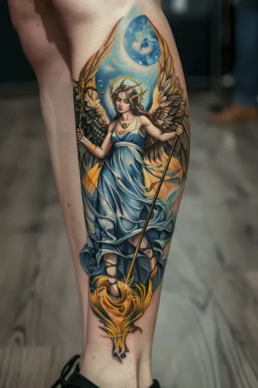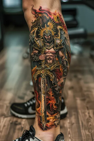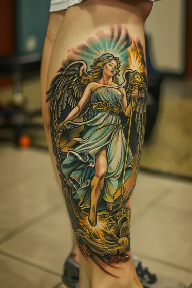Angel Warrior Tattoo on Calf with Divine Energy