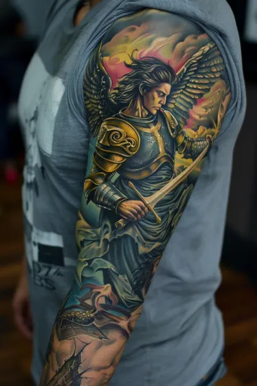 This stunning full sleeve tattoo showcases a warrior angel in motion, his dark, feathered wings spread behind him as he wields a golden sword. His battle-worn armor, with intricate gold detailing, adds to his aura of nobility and power. With flowing robes and piercing eyes, he looks down as if contemplating the weight of his duty. The stormy sky behind him, painted in soft pinks and deep oranges, gives the entire piece a dramatic and heavenly atmosphere. The lower part of the sleeve features crumbled ruins, emphasizing a story of triumph and perseverance.