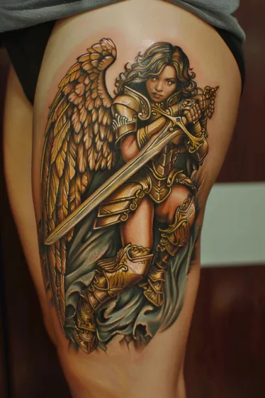 Fierce Angel Warrior Thigh Tattoo