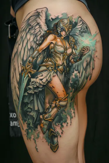 Glorious Angel Warrior Thigh Tattoo