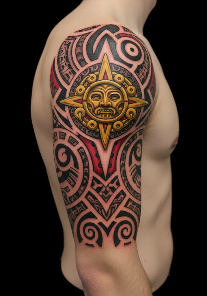 This half sleeve tattoo puts the spotlight on a striking Aztec sun god design, boldly centered with intricate black linework and deep red shading radiating from the background. The golden sun face takes over the shoulder area, with powerful geometric patterns wrapping down the arm, giving the piece a strong sense of structure and balance. Every detail feels deliberate, from the precise symmetry to the flow of the tribal-inspired shapes that frame the main design.