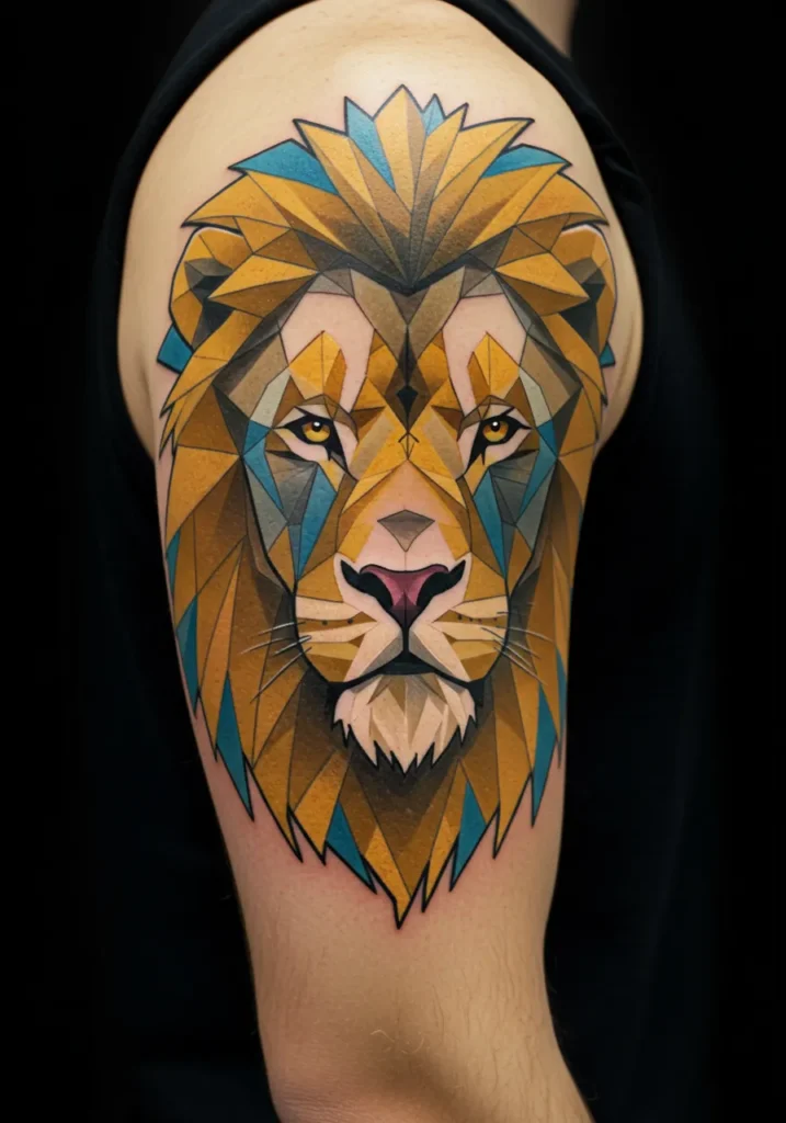 This half sleeve tattoo features a bold and modern geometric lion design that commands attention from every angle. The lion s face is crafted from sharp, angular shapes in rich shades of gold, brown, and deep blue, creating a faceted, gemstone-like effect. The piercing eyes hold a steady, intense gaze, while the mane flows naturally with a mix of crisp lines and soft gradients, blending traditional lion symbolism with contemporary artistry.