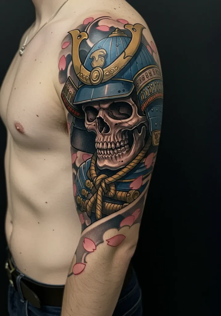 This tattoo shows off an epic samurai skull wearing a battle-worn helmet, wrapped with intricate golden ropes and soft pink cherry blossom petals floating around the edges. The armor comes alive with bold shades of blue and rich golden details, giving the whole piece a perfect mix of power and elegance. The skull itself is beautifully shaded with soft bone tones that make the expression feel intense without being over-the-top. Every little element feels polished and intentional, right down to the petal placement that softens the strong warrior vibe.