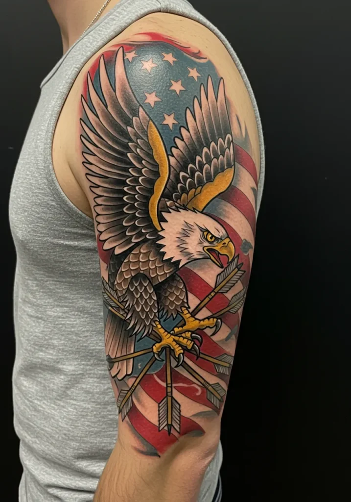 This tattoo features a bold bald eagle swooping down with its wings spread wide, clutching a bundle of arrows in its sharp talons. Behind the eagle, the American flag waves proudly with bright red stripes and a field of blue stars. The color work is striking with deep golden tones on the beak and claws, sharp black outlines, and just the right amount of shading to give the feathers real texture and movement. Everything about the design feels strong, clean, and packed with energy.