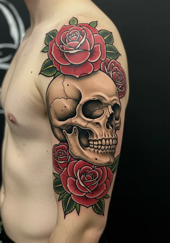 I really love how this tattoo feels both tough and beautiful at the same time. The skull brings that edgy, fearless vibe while the roses add softness and a touch of romance. It s such a gorgeous way to play with opposites. The clean lines and color work make the whole design feel polished and powerful. I honestly think this is the kind of tattoo that never goes out of style.