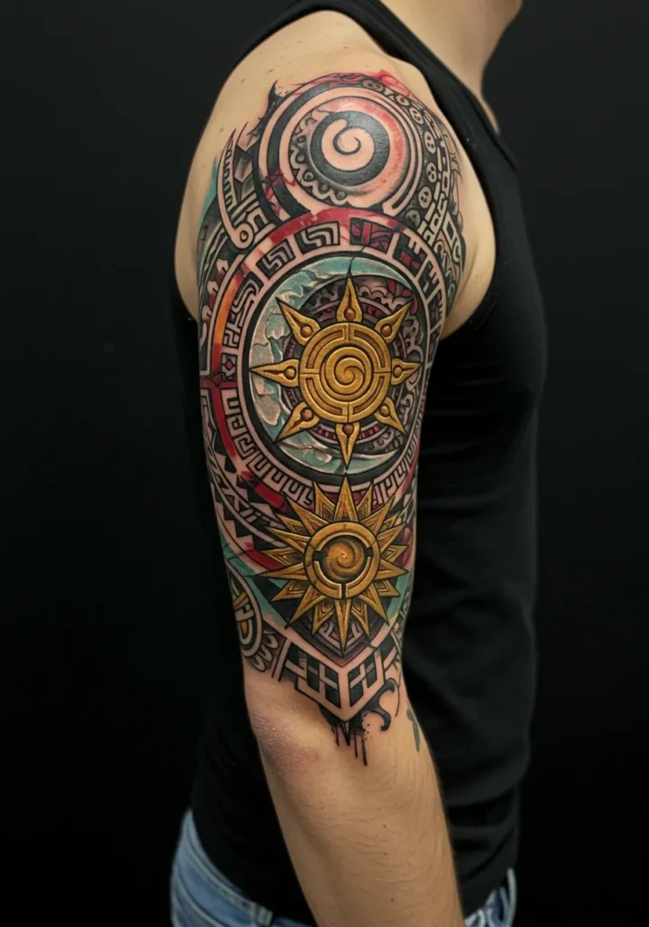 This half sleeve tattoo features two beautifully detailed Aztec-style sun symbols, each bursting with bold golden tones and surrounded by intricate geometric patterns. The background includes a mix of teal, red, and black, adding depth and contrast while framing the suns in a way that really makes them shine. The design wraps smoothly around the arm, blending traditional motifs with a modern edge, and the shading gives it almost a three-dimensional feel.