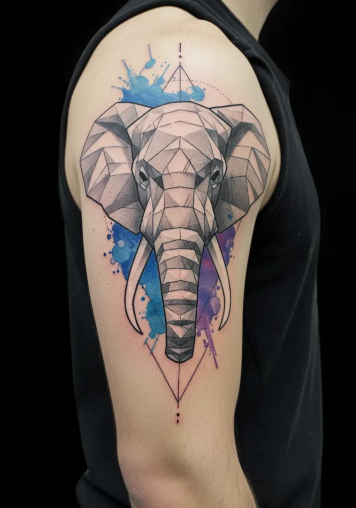 I absolutely love how this tattoo feels both strong and creative at the same time. The elephant brings all the symbolism of wisdom, strength, and calm energy, but the geometric style and watercolor splashes make it feel fresh and artistic. It s the kind of piece that stands out without shouting, and I think that s what makes it so gorgeous.