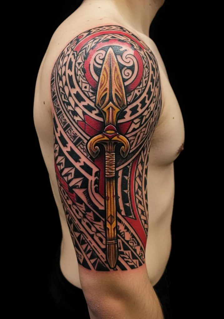 This half sleeve tattoo features a bold Polynesian-inspired design with a striking golden spearhead at the center. The black geometric patterns flow beautifully across the arm, wrapping the spearhead with layers of intricate shapes and symbols. Deep red shading fills the background, adding drama and warmth to the strong contrast of the black linework. The spear itself feels powerful and symbolic, standing out with its rich gold tones and sharp detailing that instantly draw the eye.