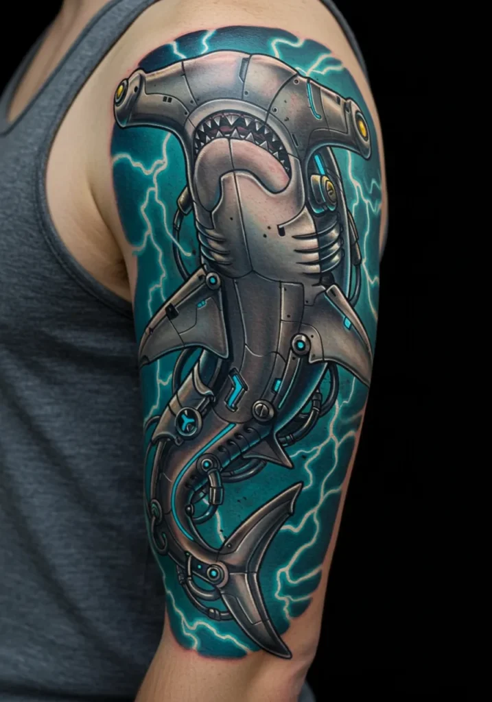 This half sleeve tattoo brings a wild twist on the classic shark design with a fully biomechanical hammerhead front and center. The body is built from sleek metallic panels and high-tech tubing, glowing with electric blue highlights that pop against a stormy teal background. Sharp teeth, robotic joints, and wired details make the shark look like a fierce underwater machine ready to rule the ocean. The soft neon lightning bolts around the edges give the whole piece extra energy and movement.