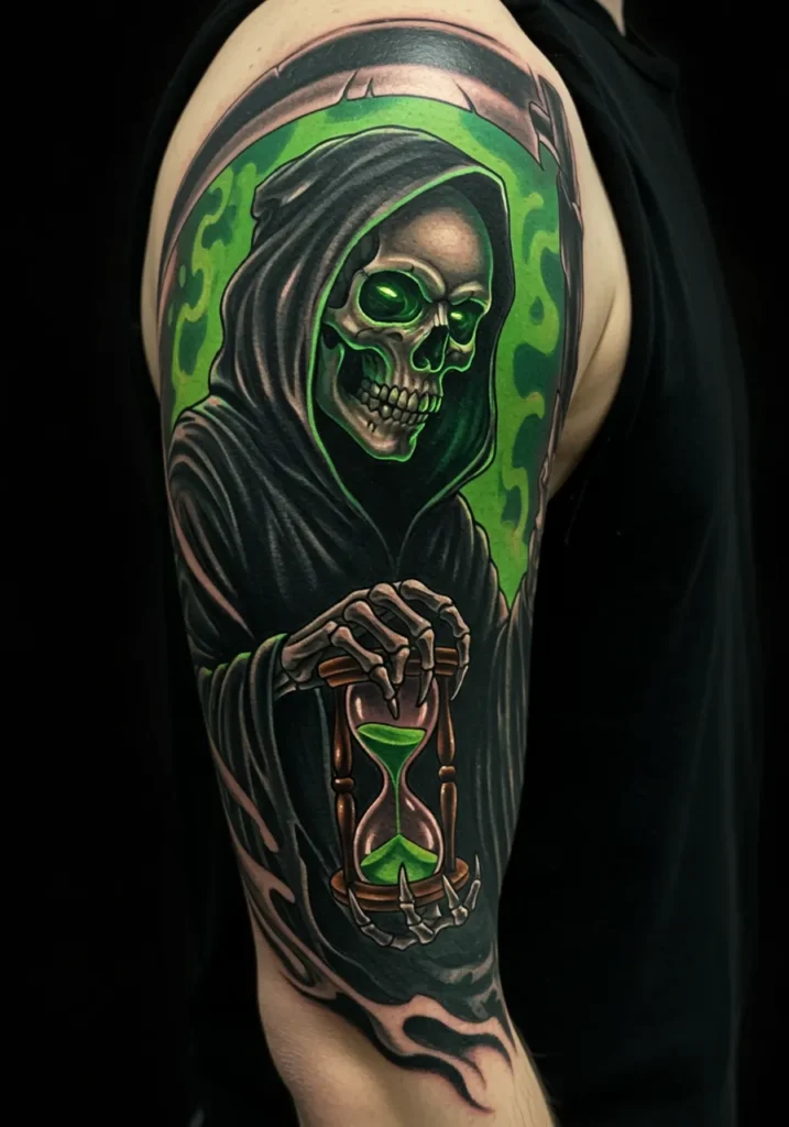 I think what makes this tattoo so impressive is how it takes a heavy symbol like the Grim Reaper and makes it feel almost hypnotic. The glowing green gives it such a cool, electric energy. I love the hourglass detail because it feels like a bold reminder that time is always ticking. There is just something about the way the whole piece flows together that makes it impossible not to stare a little longer.