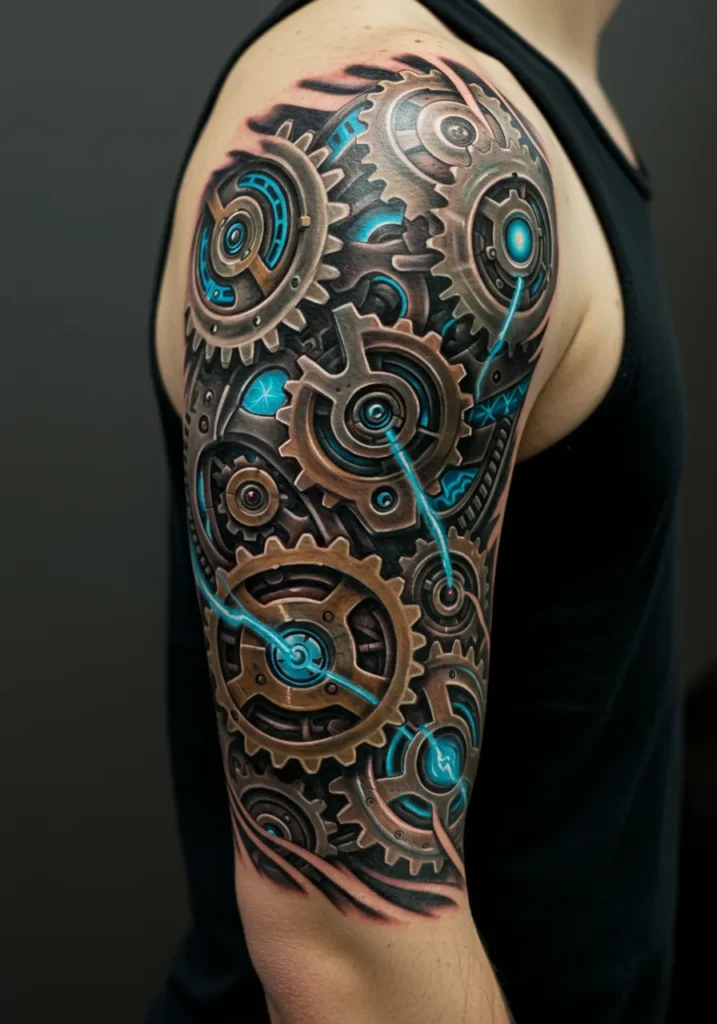 This half sleeve tattoo showcases a mesmerizing network of interlocking gears and cogs, designed in rich bronze tones with sleek black shading and bright electric blue accents running through the design like glowing energy veins. The gears are drawn with amazing depth and detail, creating a layered, almost 3D effect that makes the whole piece feel like it s in motion. Those pops of neon blue bring the perfect contrast, adding a high-tech vibe to the classic mechanical look.
