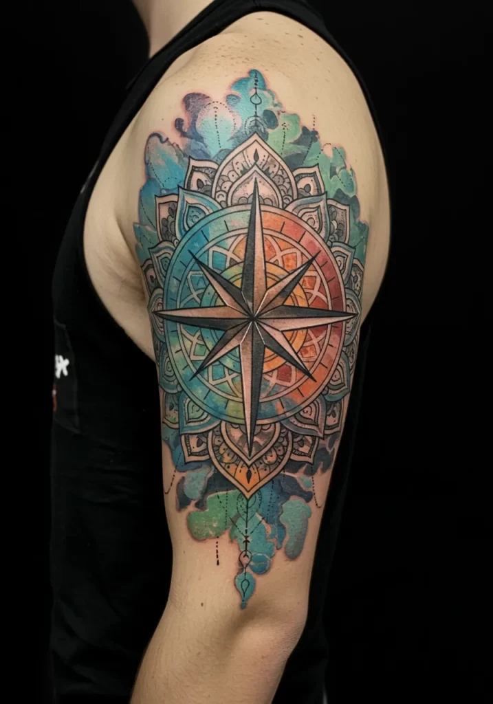 This stunning half sleeve tattoo features a bold compass rose layered over a delicate mandala design, with soft watercolor splashes of blue, green, orange, and hints of purple flowing effortlessly behind it. The detailed linework of the compass stands out beautifully against the dreamy, painted background, creating the perfect balance between structure and free-spirited artistry. The mix of geometric shapes and organic watercolor vibes makes this piece feel both grounded and adventurous at the same time.