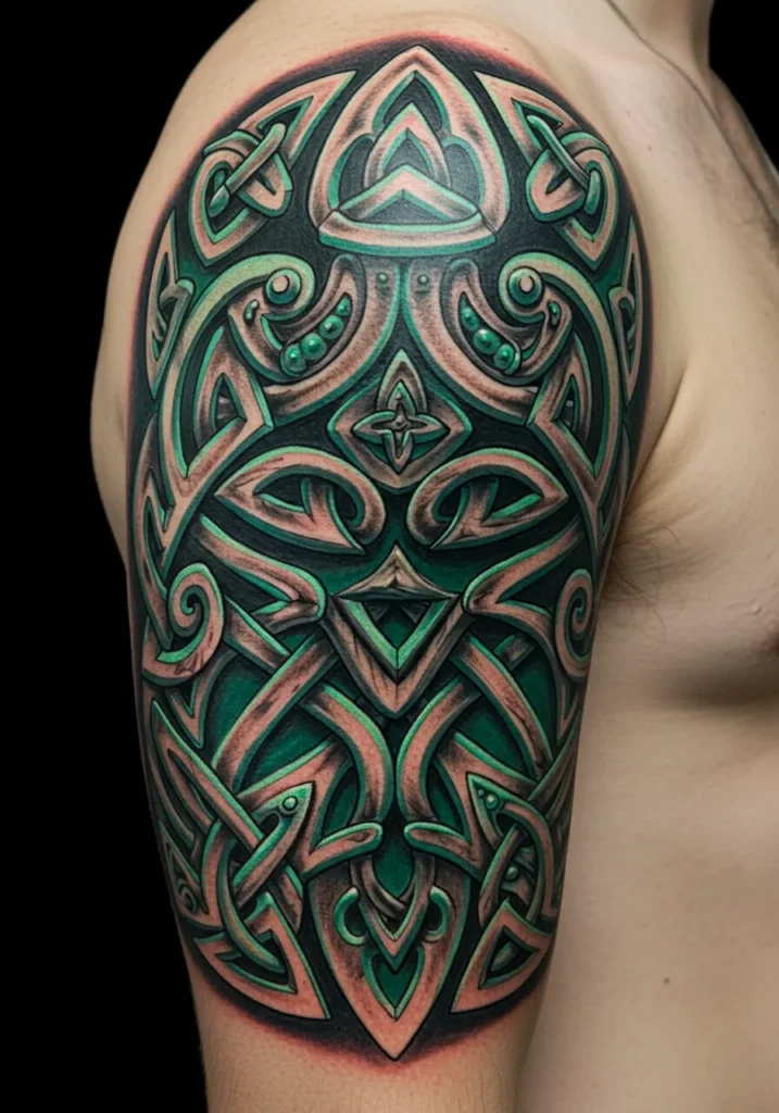 I honestly think this tattoo is such a beautiful mix of tradition and style. The knotwork feels timeless and meaningful, but the colors give it a fresh and creative twist. I love how the green makes the whole design feel alive, like it s glowing from within. It has that perfect mix of strength and elegance, which makes it really stand out in the best way.