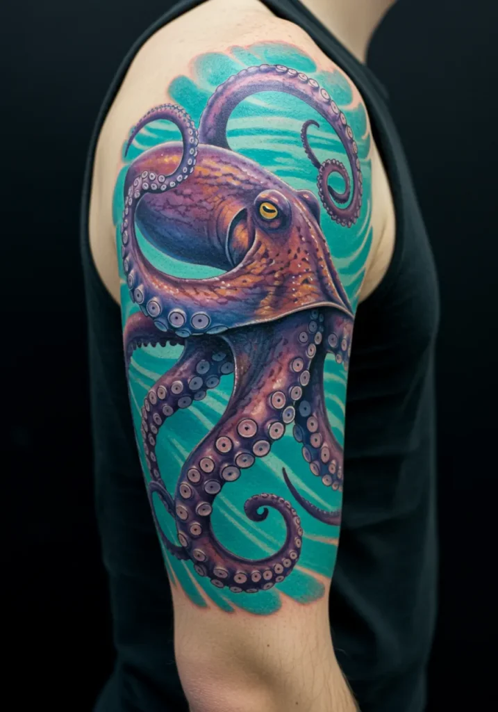 I love how this tattoo feels both wild and elegant at the same time. The colors are just stunning, and the way the octopus seems to float right off the skin makes it so eye-catching. There s something incredibly mesmerizing about the balance of strength and fluidity in this design. It feels like a piece that really tells a story.