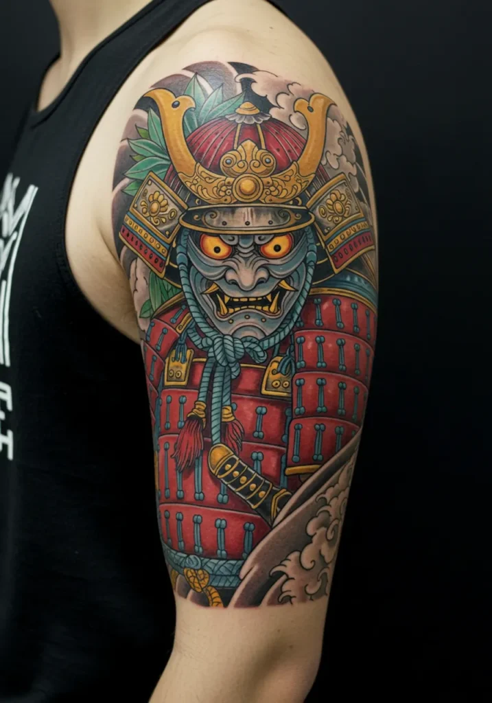 This half sleeve tattoo features a fierce Japanese samurai warrior, dressed in full battle armor with bold red and gold details that instantly catch the eye. The mask is intense with sharp yellow eyes and an expression that feels both fearless and commanding. Behind the helmet, soft green leaves and swirling smoke add beautiful contrast and a little balance to the strong, structured lines of the armor. The shading and color work are flawless, with every piece of the armor and facial features popping beautifully against the skin.