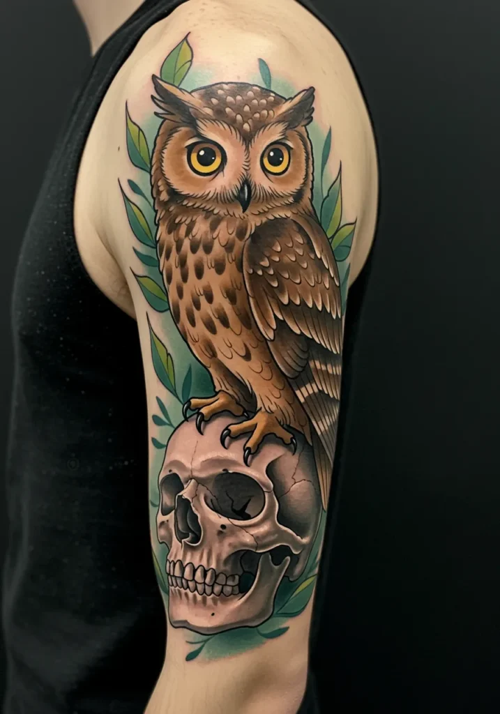 This half sleeve tattoo features a beautifully detailed brown owl perched confidently on top of a realistic skull. The owl s big golden eyes are so full of life and personality, framed by soft feathers with delicate shading and crisp line work. Fresh green leaves wrap gently around the scene, adding a pop of color and a little softness to the darker skull element below. The balance between the wise, alert owl and the rough, aged skull gives the whole piece such a striking and thoughtful vibe.