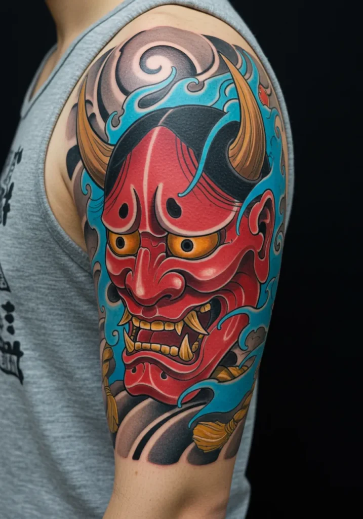 This half sleeve tattoo features a fierce red Oni mask, complete with sharp golden horns and an intense set of fangs, all framed by swirling black and blue waves. The mask s wild yellow eyes and bold black outlines give it such a striking, larger-than-life expression. The background adds flow and movement with soft curves and pops of turquoise blue, balancing out the power of the mask with a splash of cool color. Every little detail feels polished, from the dramatic shading on the face to the clean lines that make the design really pop on the skin.